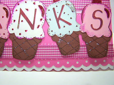 The designers' challenge this week over at Bitten by the Bug was to use the Doodlecharms cartridge, any cut we wanted, as long as we used the border feature. You know the border feature - three of any item on a single key stroke. I actually planned a cute lady bug card, titled Always a Lady (ha, ha, ha), but then I just could not resist the ice cream cones. And the ice cream flavors!!!! And the chocolate cones!!! Okay, you get the idea. I don't just love my family, the cricut, scrapping, my pj's, and Hello Kitty... I love ice cream cones! Ice cream cones are OH SO MUCH better than ice cream in a dish!