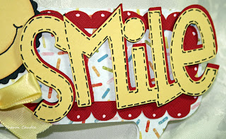 The word smile is cut out five different times and glued together for faux chipboard. I really love doing that technique! Since there is no shadow feature available on that cartridge, I simply cut the top layer in the yellow color I wanted it in, and then offset it a little from the red base. This gives the illusion of having the shadow.
